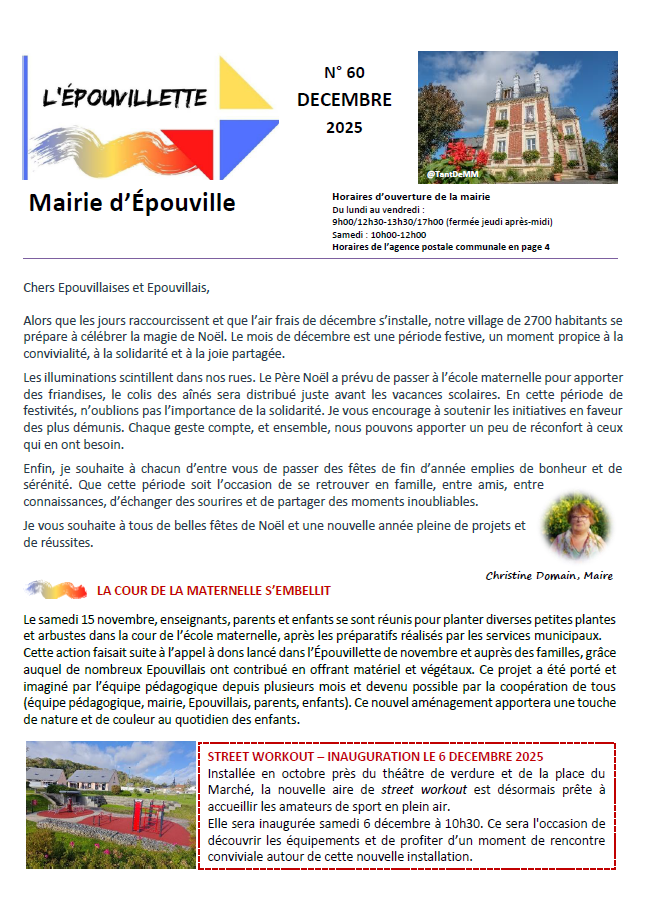 © Mairie d'Epouville Magazine municipal L'Epouvillette Décembre 2025 1 document Publié le 26 novembre 2025 lepouvillette_decembre_2025.pdf PDF-4.62 Mo Télécharger Precedent Retour à la liste Suivant