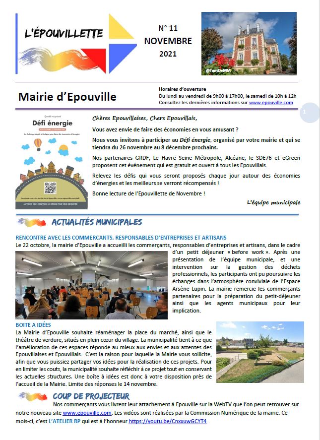 © Marie d'Epouville Magazine municipal L'Epouvillette Novembre 2021 1 document Publié le 29 octobre 2021 11-lepouvillette-novembre-2021.pdf PDF-888.97 Ko Télécharger Feuilleter Precedent Retour à la liste Suivant